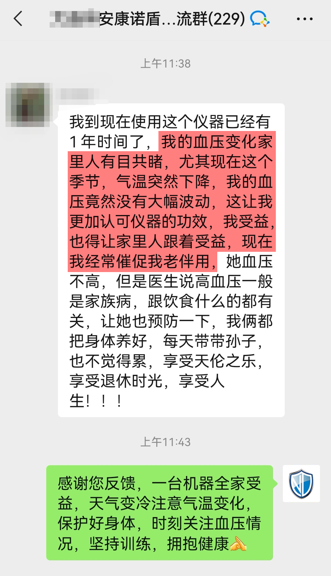 安康諾盾集團本著愿天下人人安康的宗旨,投入大量經(jīng)費,研發(fā)出安康諾盾預(yù)適應(yīng)訓練儀,使用過的用戶紛紛給出了好評并推薦給家人、朋友。