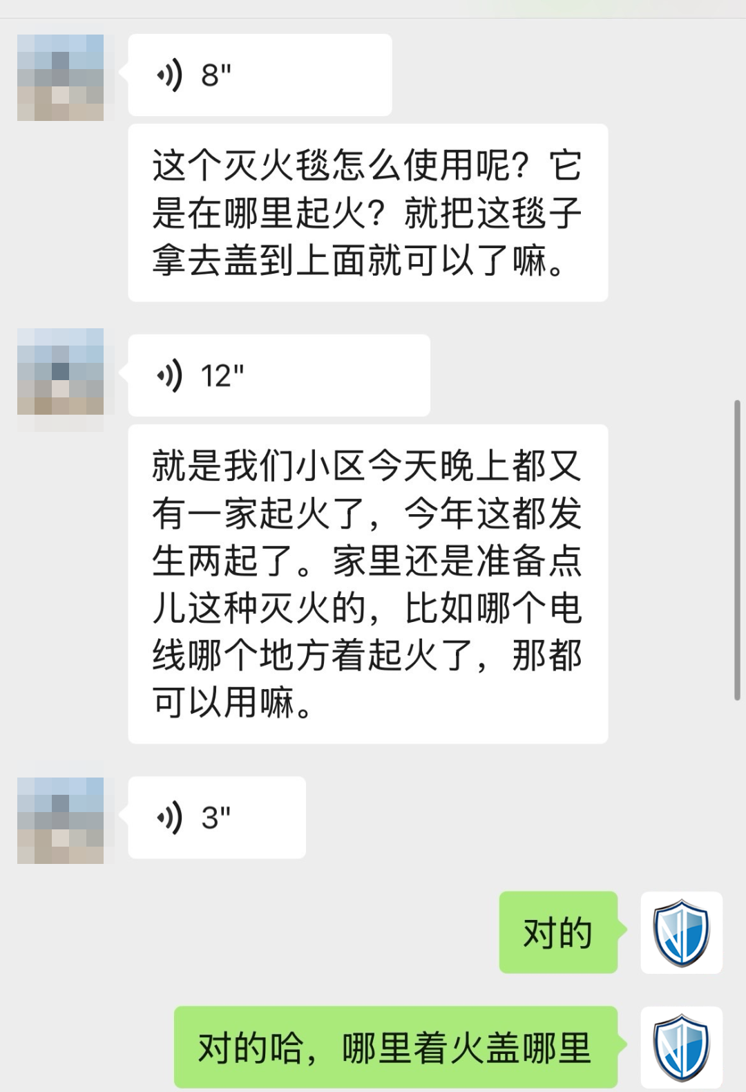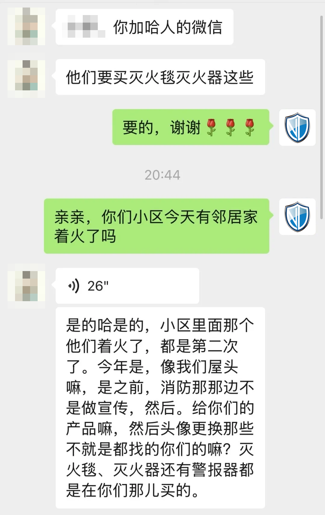 劉女士的分享很快引起了鄰居們的關(guān)注。王女士(化名)是第一個聯(lián)系安康諾盾客服的:“今年小區(qū)都發(fā)生兩起火災了,家里還是準備點滅火的器材,萬一發(fā)生火災還能用上,聽了劉女士的介紹,立馬下單了一套?!?/strong>