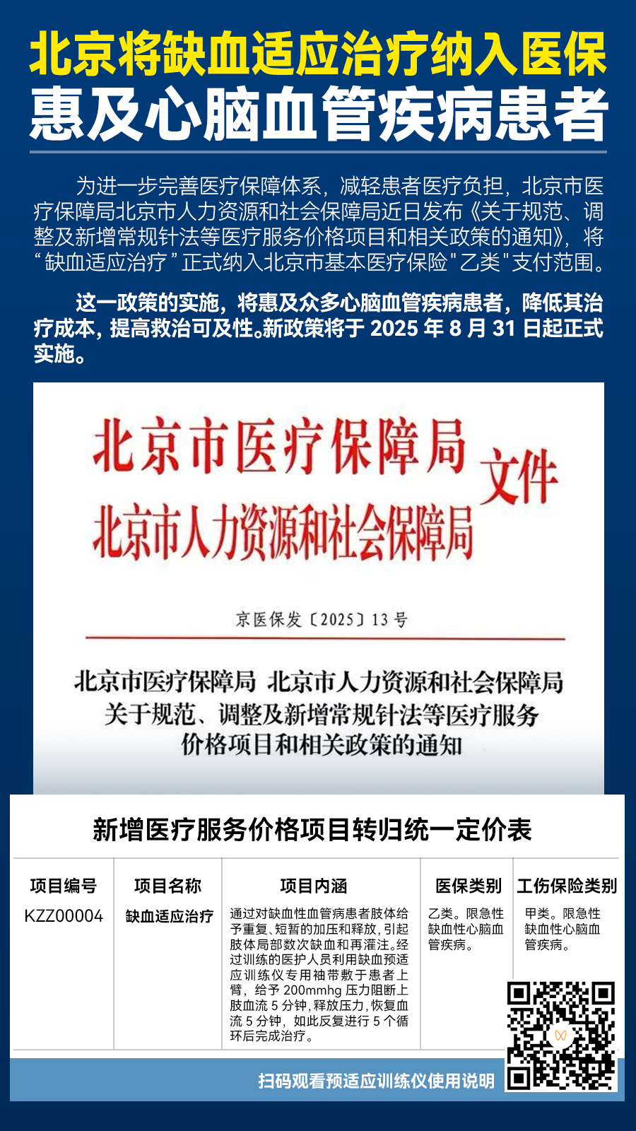 為進(jìn)一步完善醫(yī)療保障體系,減輕患者醫(yī)療負(fù)擔(dān),北京市醫(yī)療保障局北京市人力資源和社會保障局近日發(fā)布《關(guān)于規(guī)范、調(diào)整及新增常規(guī)針法等醫(yī)療服務(wù)價格項(xiàng)目和相關(guān)政策的通知》,將“缺血適應(yīng)治療”正式納入北京市基本醫(yī)療保險"乙類"支付范圍。